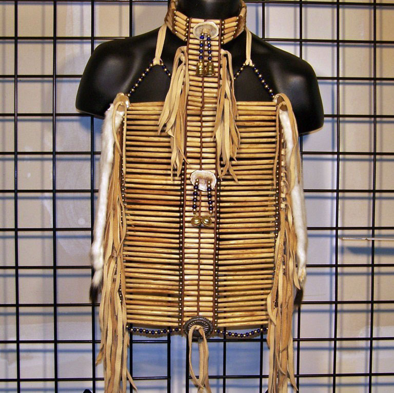 ITEM # BPS-438. Antiqued bone Warrior Breastplate Set is embelished with hand polished antler buttons ermine pelts w/tails, and smoke colored buckskin fringe. Decorated with: