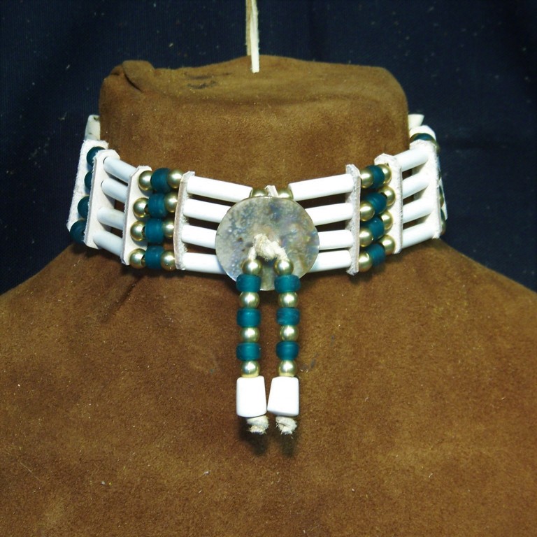 Choker was made using : WHITE BONE HAIRPIPE ~ GREEN MATTED GLASS CROW BEADS – BRASS BEADS ~ ABALONE SHELL DISC ~ LEATHER SPACERS _ SMOKE DEERSKIN LEATHER AND DOUBLE REINFORCED TIES.