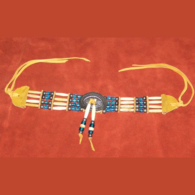 Nice bone choker (12″L) has antiqued nickel beads, deerskin, glass beads, bone disks, antiqued concho and latigo leather spacers.