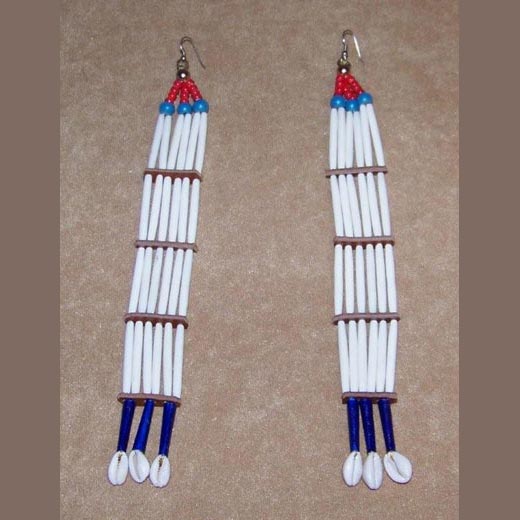 SKU: J-161As seen in many old time photographs and originally made with dentalium shells. These earrings (9″Lx1½”W) are made using thin, real bone hairpipe, latigo spacers, money cowry shells, painted cones, red “heart” beads, padre beads, nickel beads and stainless steel ear hooks.