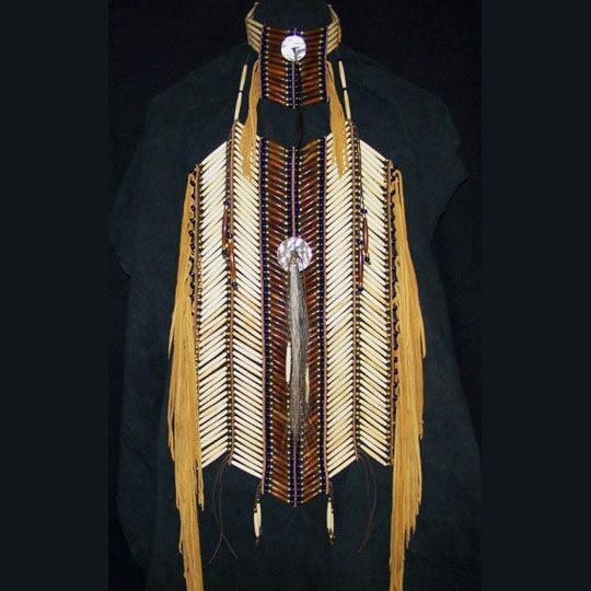 SKU: BPC-193This Breastplate is large and very impressive! It is reproduced using Antiqued Bone Hairpipe, HornHairpipe, Gold Buckskin, Abalone Disks, Horsehair, old style BrassBeads, Colbalt Crow Beads and is leather laced.