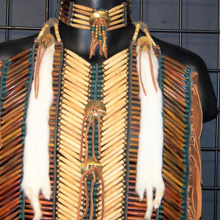 ~ ANTIQUED BONE HAIRPIPE ~ AMBER HORN HAIRPIPE ~ ERMINE SKINS ~ ELKHIDE LEATHER FRINGE ~ BRASS CONCHO’S