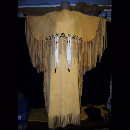 This three hide buckskin dress is typical of the dress worn by many tribes of the plains. This dress was made using a very soft gold buckskin with traditional rough side out. It features beautiful hand cut long fringe and is simply decorated with red and white glass crow beads, brass beads, steel conchos, nickle plated beads and ermine skins.