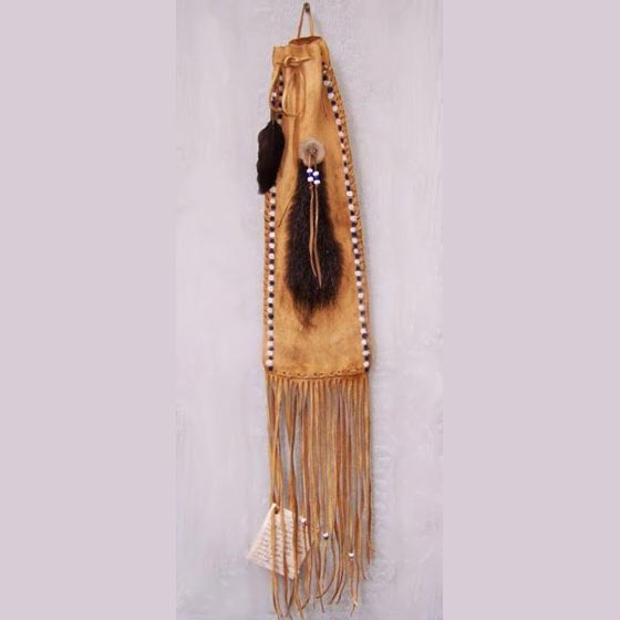 SKU: PB-179This soft gold colored Elkhide leather Pipe Bag offers great protection for your special pipe! Features Nutria Fur, Deer Antler Disk, Tin Cone, Crow Beads, and Feather. Bag is painted and has a drawstring top.