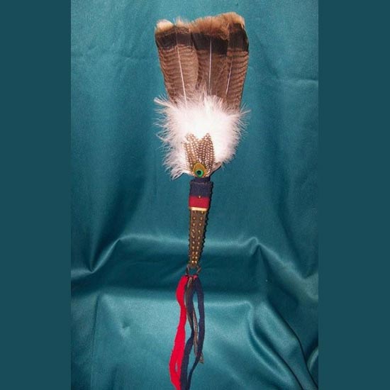 SKU: FF-167Fans were used by the medicine men and ceremonial dancers. Traditional powwow dancers still use them today. I created this fan (20″ H) including dangles, with bronze turkey tail feathers, Guinea hen feathers and a peacock feather. Also with brass tacks, eagle fluffs, trade wool, deerskin and a pine handle. Very lightweight!