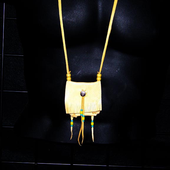 SKU: Bag-369BAG-369 > This medicine bag offers: Gold Deerskin ~ Button Enclosure ~ Assorted Glass Beads. 2 1/2″ W X 2 1/2 T