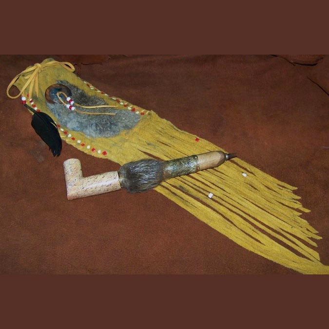 PIPE BAG is made with soft golden deerskin, hand laced with deerskin ties and features a leather disk with a “Turtleman” concho. The bag is decorated with trade beads, rabbit fur, brass cone and paint.