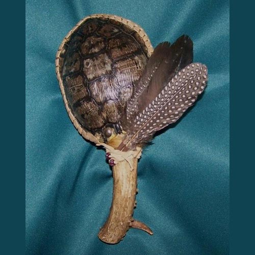 SKU: R-190This great Turtle Shell Medicine Rattle crafted with a polished Deer Antler Handle, Brain Tanned Deerskin, Brass Tacks, Guinea Hen Feathers, Trade Beads, Cones and Sinew.