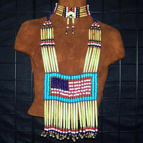 WBPS-337 This Woman's Breastplate Set includes woman's style breastplate with flag design made with Antiqued Bone Hairpipe ~ Glass Trade Beads ~ Brass “Hawk” Bells ~ Bone Beads ~ Solid Brass Beads ~ Glass “Crow” Beads. The matching Choker features a hand polished Antler Center Disc.